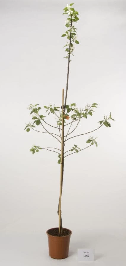 Malus domestica ‘Lena’ heeft kruisbestuiving nodig voor de produtie van appels. Bestuivers van deze soort zijn: Rajka en Topaz en vroegbloeiende sierappels. Malus domestica ‘Lena’ heeft een middelsterke groei en is redelij schurft- en meeldauwresistent. De pluktijd is half augustus. Voor vrijwel alle appelbomen geldt een aantal algemene verzorgingsaanwijzingen. Allereerst moet de grond geschikt zijn. Op schrale zandgronden of zware klei is het belangrijk de grond te verbeteren met bijvoorbeeld Vivimus bodemverbeteraar, of anders potgrond, goede compost en evt. wat oude mest. Alle soorten fruitbomen (M.u.v. de struikvorm in pot) moeten de eerste 2 tot 3 jaar ondersteund worden met korte of lange boompalen. Dit om te voorkomen dat de boom scheef waait en de nieuw gevormde wortels afbreken als de kluit beweegt. Zorg ook voor voldoende water, zeker in het eerste jaar. Fruitbomen goed snoeien is een vak apart, maar in zijn algemeenheid geldt dat er 3 of 5 hoofdtakken moeten blijven staan waaraan zijtakken met bloemen en vruchten kunnen groeien. Snoei in de winter overbodige ‘waterloten’ (lange dunne takjes boven in de boom) weg. Takken moeten elkaar bij voorkeur niet kruisen en de boom moet enigszins open blijven. En uiteraard zal een boom in iedere tuin een andere gewenste grootte hebben. Voor kleinere tuinen (<200 m2) zal een struikvorm het meest geschikt zijn (2 – 3,5 m) In een wat ruimere tuin (200 – 500 m2) kan een halfstam uitgroeien tot een kleine boom (2,5 – 4 m) en in een grote tuin of weide in het buitengebied kan een hoogstamboom goed tot zijn recht komen (hoogte 3 – 6 m). Als u geen last wilt hebben van de veelvoorkomende ziekten is het (zeker in gebieden met veel appelteelt) een zinnige overweging om te kiezen voor één van de nieuwere resistente soorten als o.a. Ecolette, Topaz, Santana, Rosette, Rajka, Rubinola of Groninger Kroon. Ook is het belangrijk om te kijken of de boom zelfbestuivend is of niet. Als dit niet zo is moet er een ander appelras binnen zo’n 100 meter staan om een goede opbrengst te krijgen.