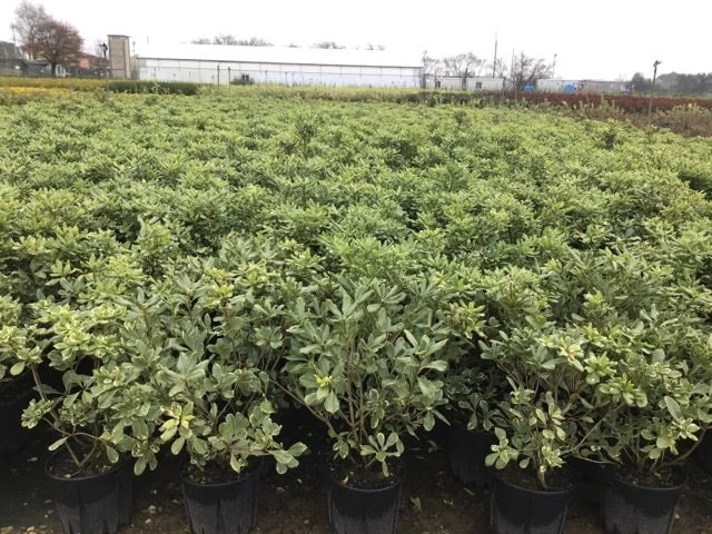 Pittosporum tobira ‘Variegatum’ bloeit in het voorjaar met witte bloemen die lekker ruiken.