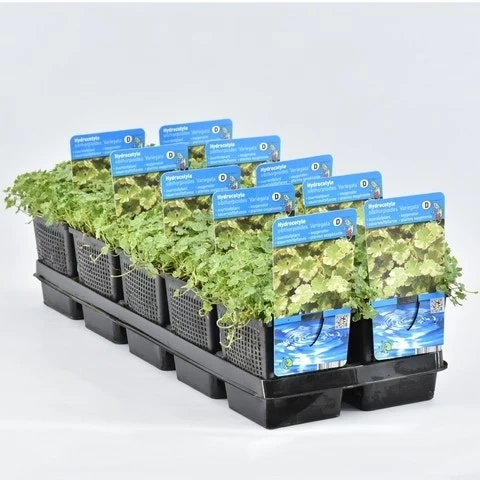 Hydrocotyle sib. ‘Variegata’ is een vijverplant waarvan het blad een soort matten vormt aan het wateroppervlak. De bonte variant heeft een cremewitte bladrand.