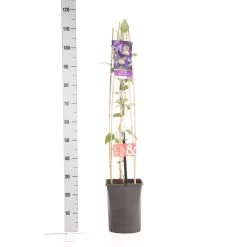 Bosrank (Clematis ‘Blue Pirouette’) bloeit met bijzondere paarse bloemen, en bloeit in juni-september. De Clematis ‘Blue Pirouette’ heeft een volwassen hoogte van 2 meter en bereikt deze in ongeveer 3 jaar. De Clematis ‘Blue Pirouette’ is bladverliezend in de winter, en is zeer winterhard, temperaturen tot -28 graden Celsius zijn geen enkel probleem. U snoeit deze Bosrank aan het eind van de winter/begin voorjaar. Als u de Bosrank ‘Blue Pirouette’ wilt gebruiken langs schutting, muur, of gevel, raden wij 3 planten per strekkende meter aan voor een mooi vol resultaat. Bij lagere schuttingen of muren kunt u dit aantal verminderen omdat de Bosrank wel ruimte nodig heeft om te kunnen groeien.