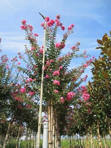 Lagerstoemia indica (Lagerstroemia) is een opvallende exotische boom door het ontbreken van de bast om de stam. Het is een zeer langzaam groeiende boom, die graag beschut staat in de zon. De stam heeft een lichte opvallende geelgroene kleur. De bloemen verschijnen in de zomer aan de Lagerstroemia. De bloem bloeit in een pluim en lijkt een beetje op een bloem van een Sering. Lagerstroemia is winterhard tot -10 graden. Bij strenge vorst kunt u de boom beschermen. Het is belangrijk dat de grond in de winter net nat is. Lagerstroemia indica is een bladverliezende exotische boom. De Lagerstroemia kunt u ook goed als kuipplant gebruiken, een aanrader!