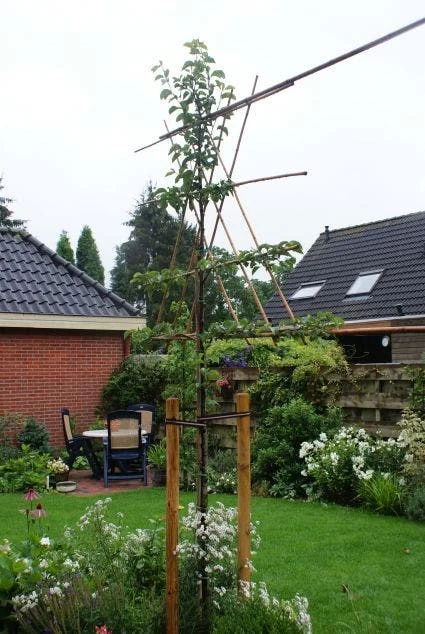 Pyrus calleryana ‘Chanticleer’ als leiboom gekweekt. Deze leiboom krijgt zeer veel witte kleine bloemetjes die soms al in maart aan de leiboom zitten. De bladeren blijven zeer lang aan de Sierpeer als leiboom zitten. In de herfst verkleuren ze ook nog eens naar geelrood. In de zomer zijn de bladeren glanzend donkergroen. Het leirek is 150cm breed en 120cm hoog en heeft vier etage’s. De stam hoogtes zijn van 180 cm tot 220cm hoog, de gewenste hoogte kunt u aangeven bij opmerkingen in de winkelwagen.