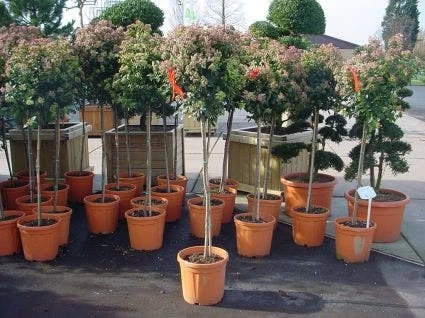 Het gaat hier om de Viburnum tinus ‘Eve Price’ op stam. De vermelde maten zijn stamhoogtes.