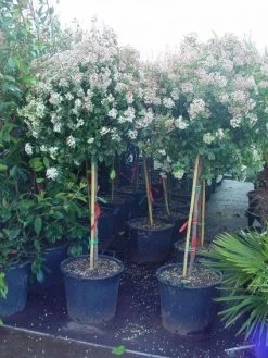 Het gaat hier om de Viburnum tinus ‘Eve Price’ op stam. De vermelde maten zijn stamhoogtes.