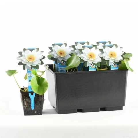 Nymphaea ‘Gladstoniana’ is een rijk bloeiende waterlelie met witte, stervormige bloemen, van juni tot september. Het blad loopt rood uit en wordt vervolgens langzaam groen. Waterlelies staan graag op een zonnige plek.